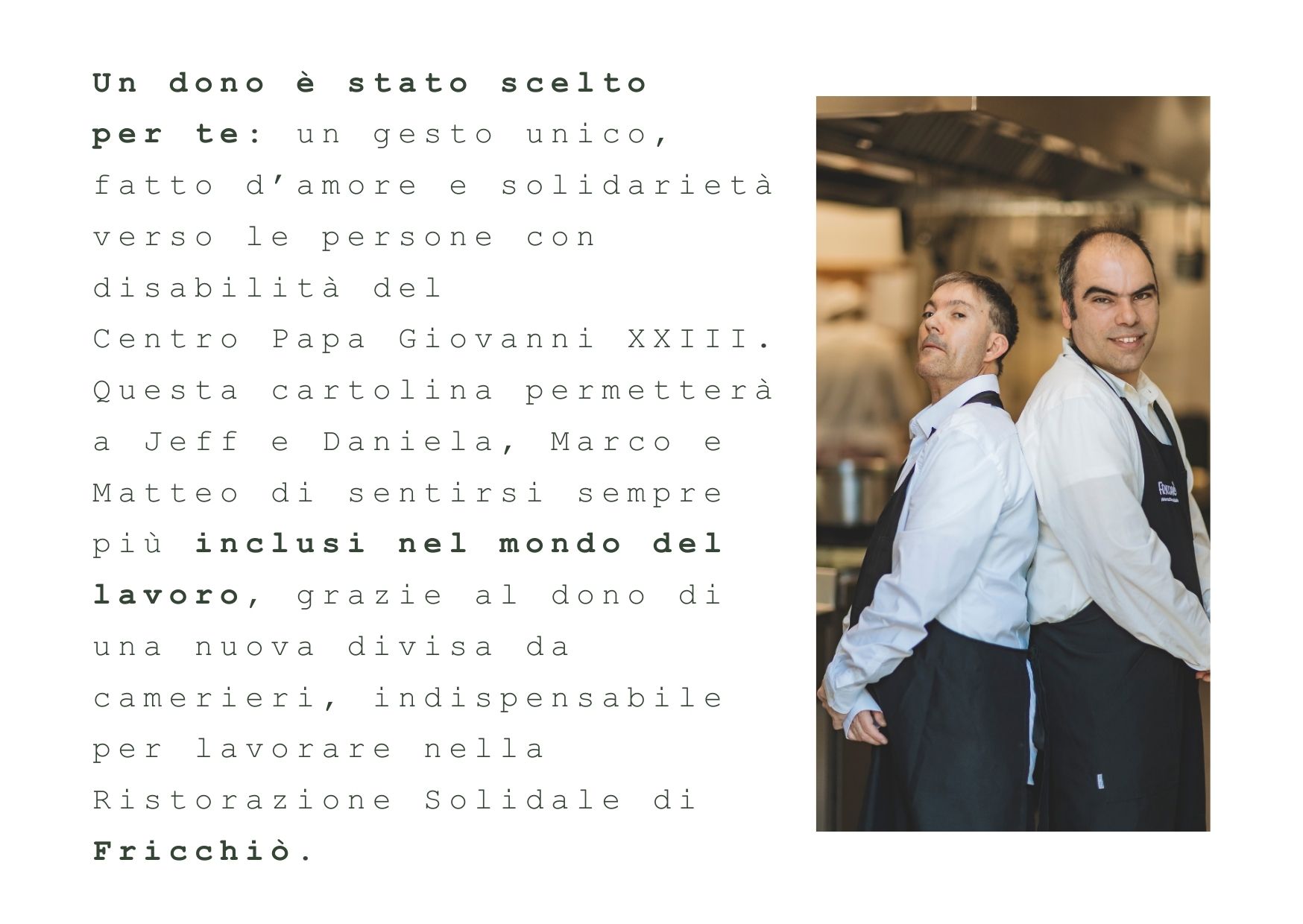 Fricchiò è la Ristorazione Solidale del Centro Papa Giovanni XXIII, un servizio di catering e ristorazione nato per offrire opportunità di lavoro a persone con disabilità e differenti fragilità. Un progetto di reale inclusione lavorativa che valorizza talenti e desideri, trasformandoli in piatti genuini della tradizione.